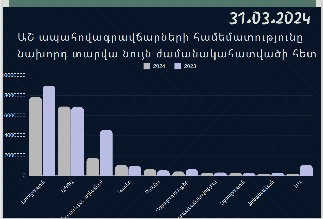 Ներկայացնում ենք ապահովագրական ընկերությունների կողմից հավաքագրված ապահովագրավճարների մեծությունների համեմատությունը 2024թ․ 1-ին եռամսյակի համար (2024թ․ և 2023թ․ համեմատություն).