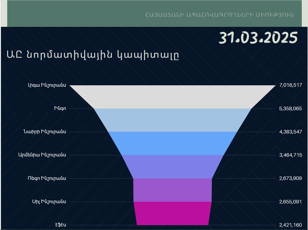Ներկայացնում ենք Հայաստանում գործող ապահովագրական 7 ընկերությունների նորմատիվային կապիտալը 2025թ․ մարտի 31-ի դրությամբ (ճշգրտված)․
