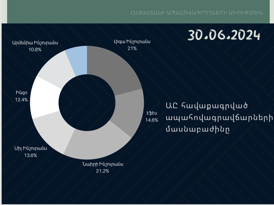 Ներկայացնում ենք Հայաստանում գործող ապահովագրական 7 ընկերությունների հավաքագրած ապահովագրավճարների մասնաբաժինը 30․06․2024թ․ դրությամբ․