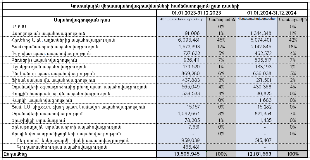Ներկայացնում ենք ապահովագրական շուկայի՝ ըստ դասերի կուտակային վերաապահովագրավճարների համեմատությունը 2024թ․ չորրորդ եռամսյակի համար (2024 և 2023թթ․)․